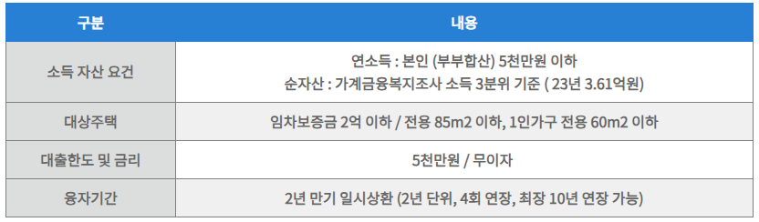 비정상 거처에 사는 분들을 위한 전세자금 대출 상품으로, 주택 임차 보증금을 무이자로 지원합니다.