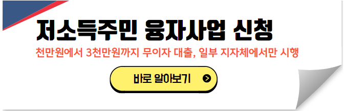저소득층 주민을 대상으로 생활비를 무이자로 대출해주는 제도입니다. 지자체별로 지원 내용이 다르므로, 해당 시청 홈페이지에서 확인 후 신청해야 합니다.