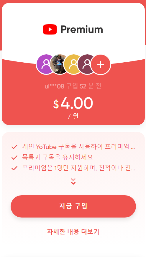 요즘 유튜브 많이 보시죠? 프리미어가 아니신 분들은 특히 광고때문에 번거롭다는 생각 자주 해보셨을 겁니다. 하지만 유튜브 프리미어 멤버십이 너무 비싸기 때문에 그냥 참고 보시는 분들이 많으실텐데요, 만일 월 4달라, 현재 기준으로 약 5천원에 유튜브 프리미엄을 볼 수 있다면 어떨까요?