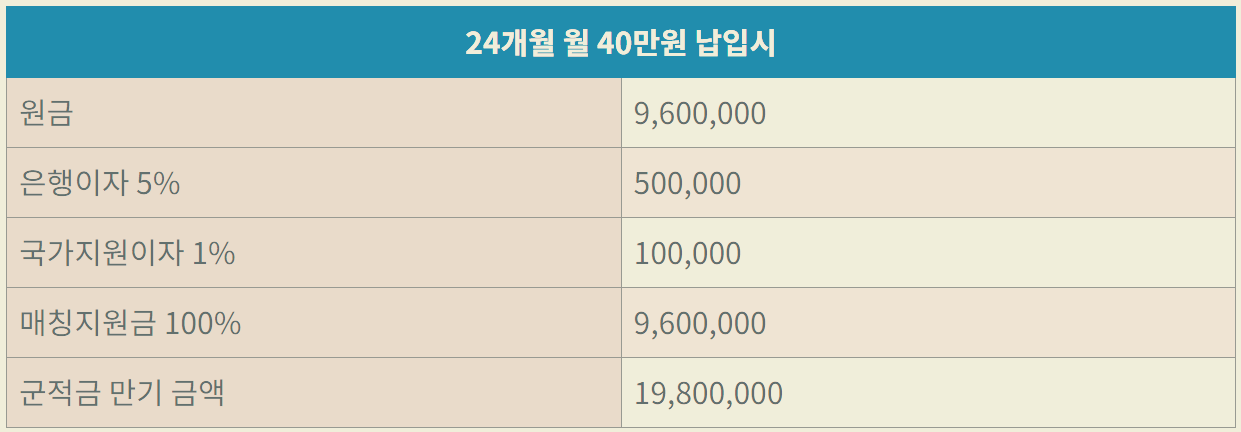 장병내일준비적금 만기 시 받을 수 있는 금액은 아래와 같습니다. 만일 잘 모르시는 부분이 있다면 아래 군장병내일준비적금 계산기를 통해 계산하시면 금방 아실 수 있습니다.